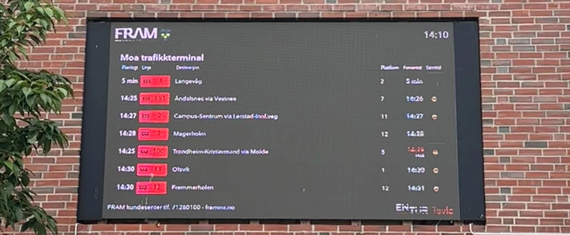 Med Tavla kan du få oversikt og svar på alle disse spørsmålene man ofte stiller seg i en travel hverdag. Sett opp en tavle på en skjerm på jobb, i resepsjonen eller på et kjøpesenter. Du kan velge blant all offentlig transport i Norge, alt fra busser i Kristiansand til ferger og hurtigbåtavganger fra Bodø. Det trengs ingen teknisk kompetanse for å lage en avgangstavle.